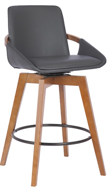 The Baylor Bar Height Stool frame and legs are crafted with sturdy and durable wood, giving you years of enjoyment. This bar stool features a 360-degree swivel function which increases mobility for a greater user experience. The sleek, smooth lines featured throughout the body of this bar or counter height chair combined with the look of the soft faux leather upholstery create harmony throughout this piece. This stool also includes a circular metal footrest, which is both visually appealing and practical for the design. The Baylor Bar or Counter Height Stool is available in 26-inch counter height and 30-inch bar height. Also available in your choice of cream or gray faux leather with walnut wood finish or black brushed wood finish. Excellent choice for a contemporary dining setting.