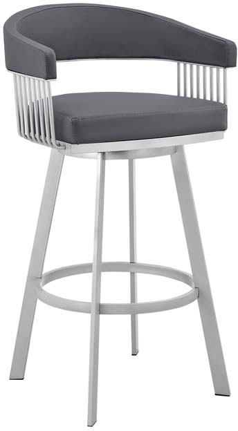 This stool comes in your color choice of black, or gray faux leather with black metal finish, chocolate faux leather with java finish, black or gray faux leather with brushed stainless steel finish, or white or grey faux leather with silver finish.