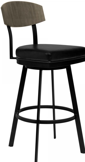Frisco Mid-Century Barstool in Matte Black Finish and Vintage Black Faux Leather with Grey Walnut Wood.