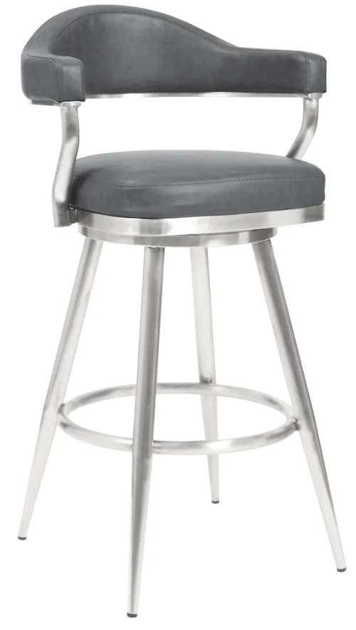 The modern open back offers a design that flows seamlessly into the arms, as if giving you and your guests a soft hug. The Justin barstool is generously padded with high-density foam to ensure a comfy stay. Our barstool is upholstered in performance fabric or high-quality faux leather to offer lasting style and comfort. Perched upon round and tapered metal legs that include floor protectors, this stool makes a sophisticated impact anywhere from your kitchen to your home office. It remains a chic and elegant fit for your kitchen island, pub table, home bar, or adjustable desk. The stool includes a built-in circular footrest to offer a comfortable sitting experience. Its smooth 360-degree swivel function allows for maximum mobility, enabling you to change directions and follow conversations with ease. The Justin Swivel Counter or Bar Height Stool several different finishes, colors, and textile combinations to make a sleek and fashion-forward statement in any home. Choose whichever design suits your space, and enjoy this minimal assembly barstool that is sure to stand out!