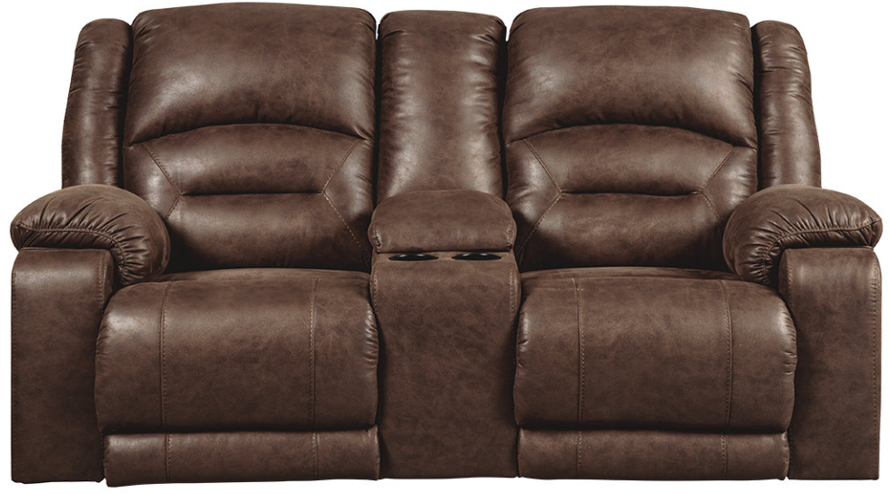 The Carrarse power reclining loveseat in teak brown really is designed to caress you in comfort from head to toe. Offering the warm feel of fabric and the cool look of leather, this power reclining loveseat includes Easy View™ power adjustable headrests and power lumbar support that lets you fully recline and still have a primo view of the TV.Read More
