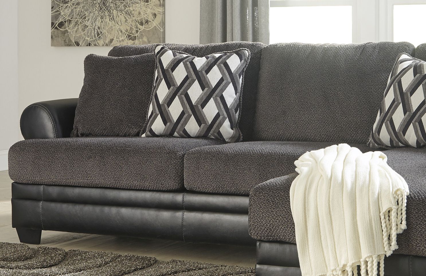 Feel the smoky vibe of the Kumasi left-arm facing sofa that is casual, contemporary, and cool. Plop down on plush cushioning and nestle into pillow backs for a cloud-like feel. Dark leatherette frame trimming, soft upholstery, and faux woodblock legs grounds your space in the edgy, contemporary style you love. Experience lavish comfort in the contemporary chic design you desire with the Kumasi LAF sofa and the rest of the Kumasi sectional.