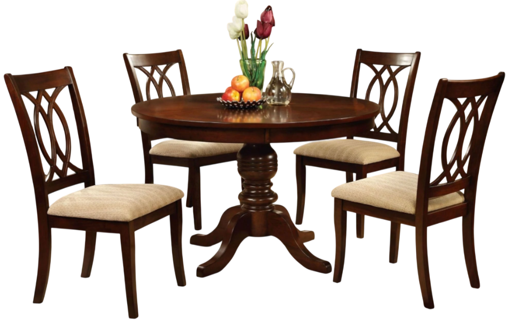 Add style to your small dining room with this round pedestal table. Both finished in brown cherry, the table and chairs complement each other well to produce a striking, transitional piece.