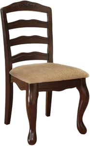 The matching side chairs feature padded seats with a delicate floral motif. The ladder design back has soft, curvy lines instead of straight ones, while the front legs' use of Queen Anne style enforces this theme of delicateness.