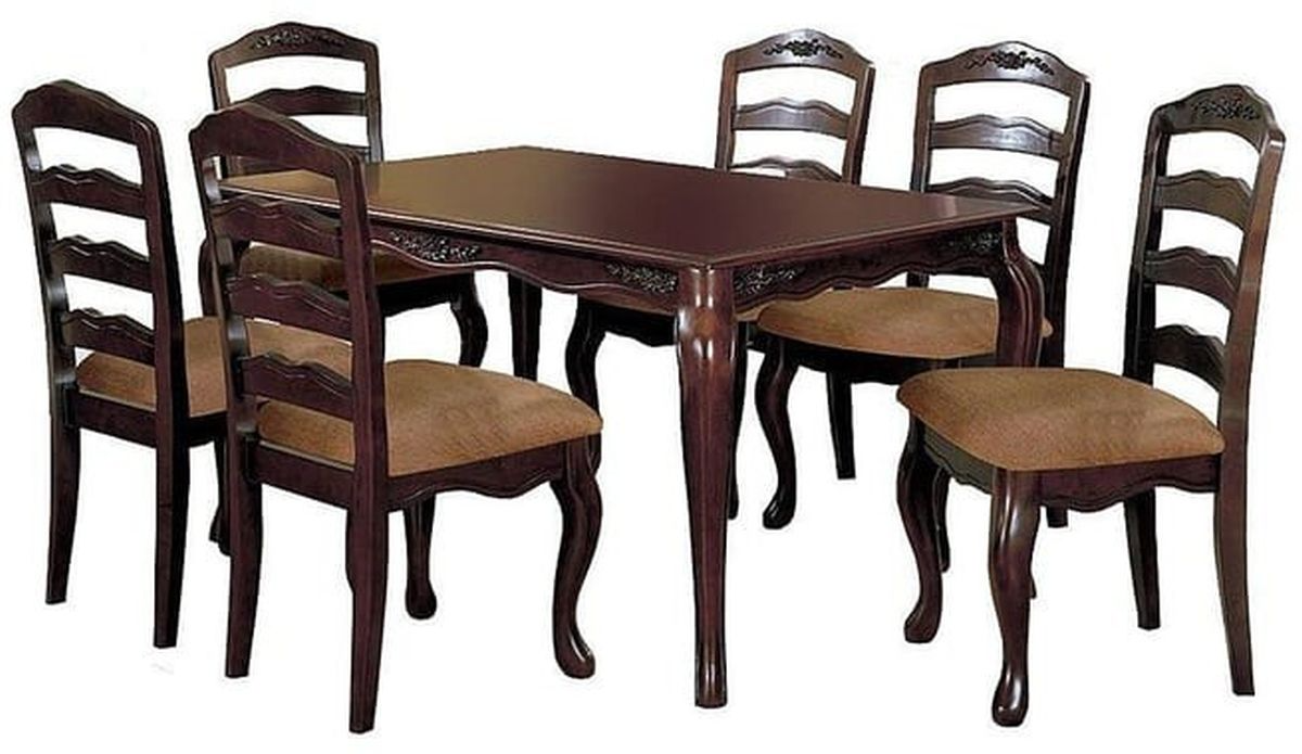 Complement a dining room with this classic dining set for six or eight finished in dark walnut. The matching side chairs feature a delicate floral motif and have padded seats.