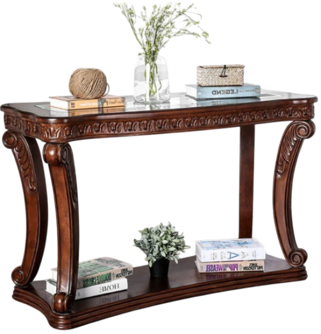 This occasional table is grounded in sophistication and class. Beautifully carved details run the length of the table skirt before dancing along the curving cabriole legs. The combination of a bottom display shelf and a 5mm tempered glass top give you a stunning display viewing area of your decorations. This table comes finished in a lush dark oak that's showcases an absolutely gorgeous swirling wooden grain.