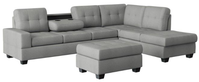 This Maston Sectional with Ottoman Set is upholstered in a light gray fabric features a drop-down cup holders and storage ottoman. Meticulously crafted, this seats provide unsurpassed comfort without sacrificing style. You'll love how this stunning sectional set transforms your space.Read More