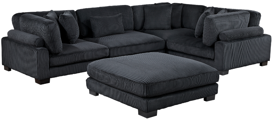 Configurable to your available space, the Traverse Collection allows for the addition and detachment of pieces for a customized seating experience. The 5-piece sectional configuration consists of three corner units paired with one armless chair, and an ottoman. The black corduroy fabric upholstery creates a plush expanse for a soft touch experience.Read More