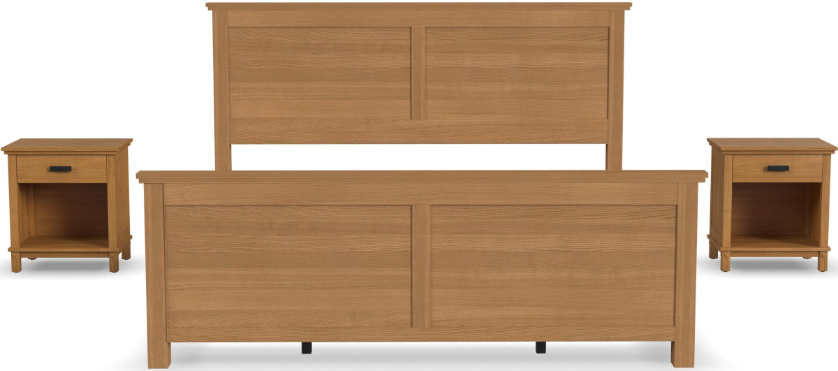 The headboard and footboard feature a timeless double panel design. The nightstands offer a convenient place for all your bedside items, and the added space below is perfect for storing books, tablets, and more. Stained in a light oak finish, this craftsman-style bedroom set will fit right in with existing furniture, or help you create a new look.