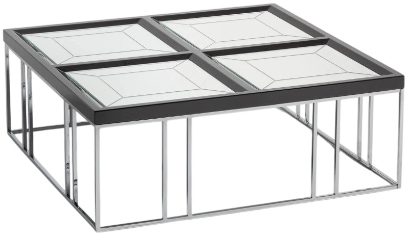The Carmela cocktail table is a masterpiece of design, featuring slender silver legs that give way to a seductive charcoal sand top. The four mirrored inlay squares with in the tabletop create an alluring play of light and dimension that will captivate your guests and leave them breathless.Read More