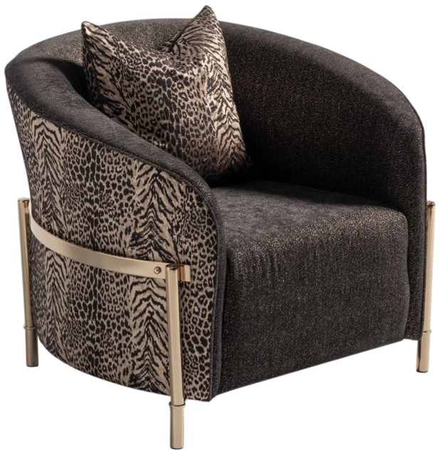 Embrace luxury with our chic chair, showcasing artful curves, a resplendent gold metal frame, and sophisticated onyx chenille fabric. The captivating tiger eye chenille jacquard on the back, paired with a matching pillow exudes charm and elegance for unparalleled style and comfort.Read More