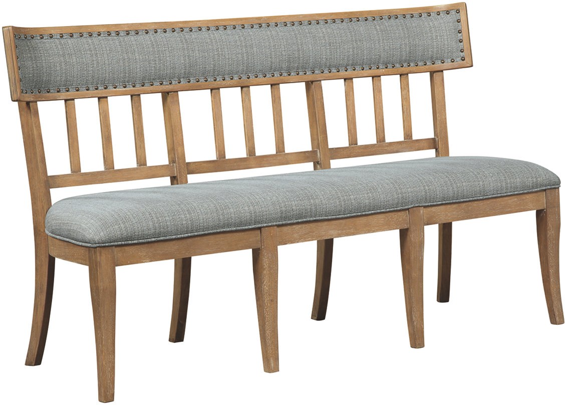 Luring with an easy-on-the-eyes finish inspired by the romantic beauty of aged oak barrels and wine country interiors, the Ollesburg dining room bench is indeed something to savor. Wide settee styling with wraparound back rail is a charming throwback, while multi-tonal fabric weaves together a tapestry of tones—from grayish blue to beige and brown—for a richly neutral look that feels fresh and now.