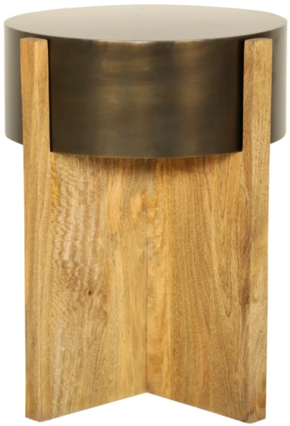 The Aspen bronze end table features a sculptural round silhouette crafted from wood with a warm bronze finish, with floating metal drum details, perfect for layering beside a sofa or chair any interiors.Read More