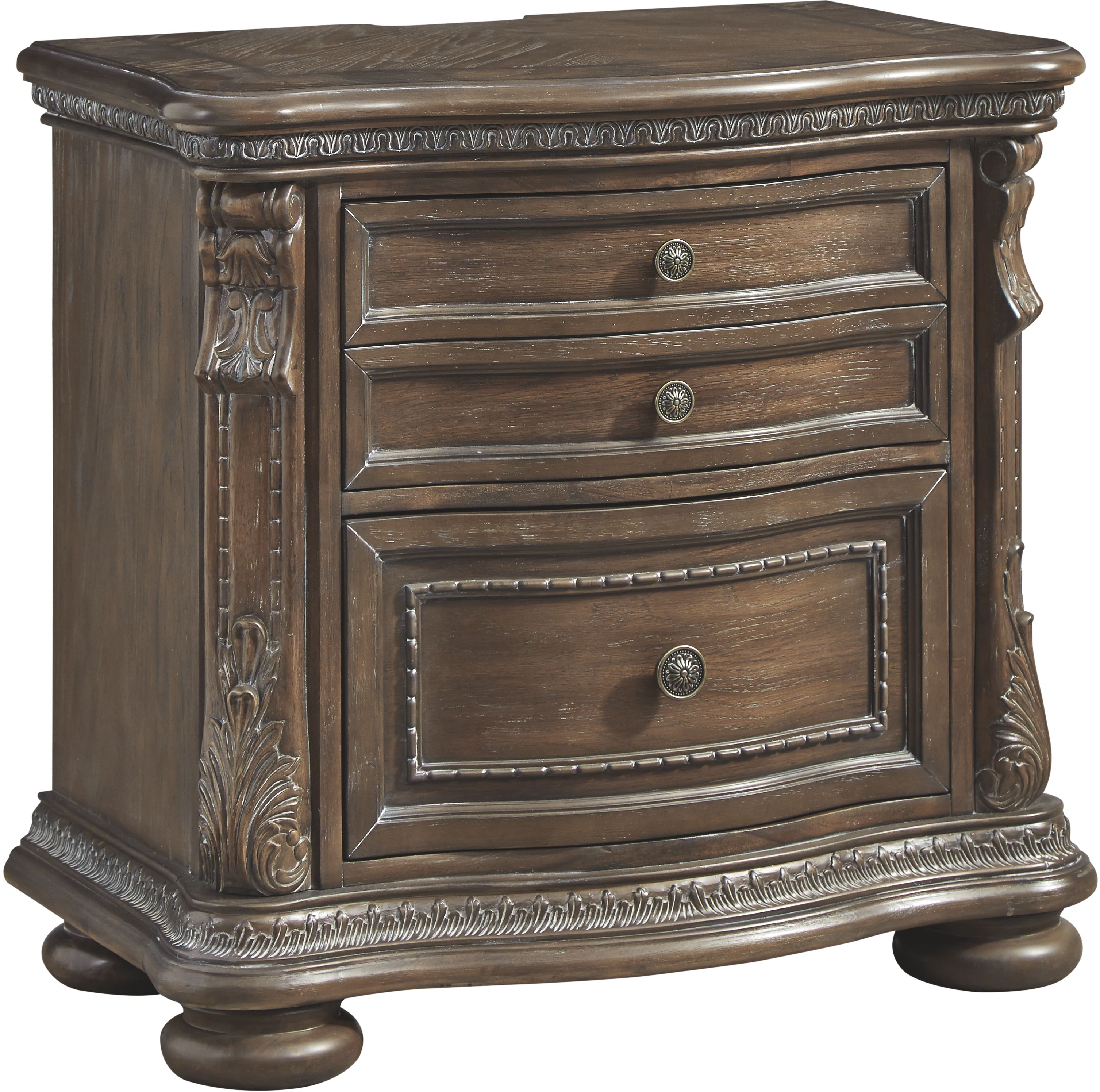 Charming and convenient for your bedroom, the Charmond brown nightstand has antiqued bronze-tone hardware and ornate wood carvings that will stand out for years to come.