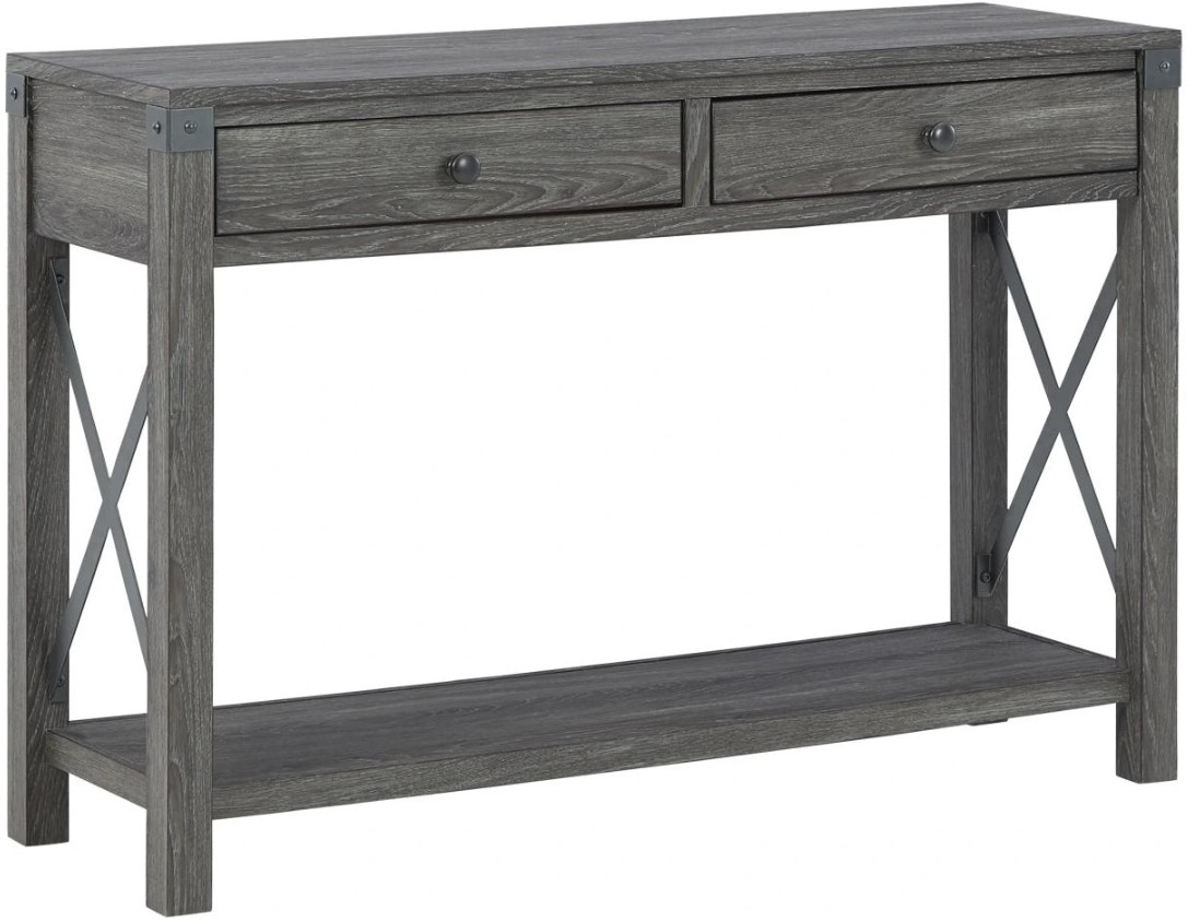 Open the door to modern farmhouse style with this console table. The beautiful woodgrain look and classic crossbuck metal accents are a cool touch, while the lower shelf provides surface space for fashionable home accessories. A pair of smooth-gliding drawers is the answer to the daily, where-are-my-keys question.Read More