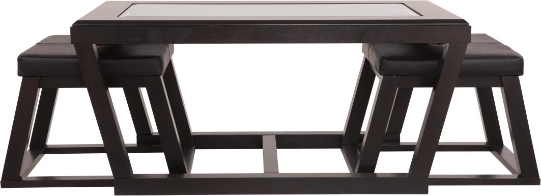 With the beveled glass of the Kelton coffee table set, placing drinks or staging décor becomes a treat. When guests arrive, simply pull out the 2 faux-leather nesting stools so everyone can join in the fun.